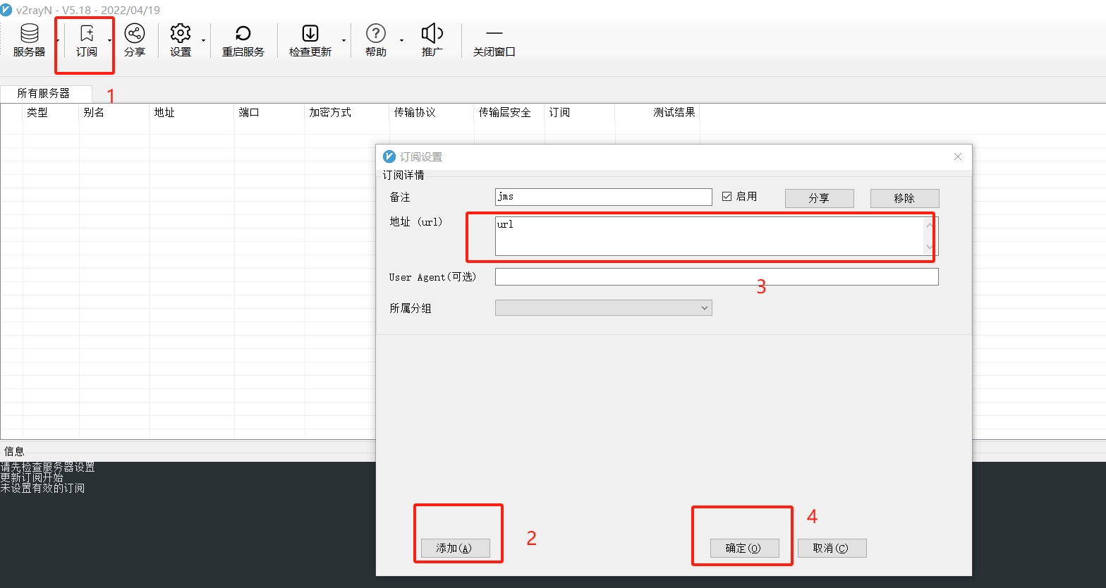 3. 在"地址(url)"处粘贴 Just My Socks 的订阅链接